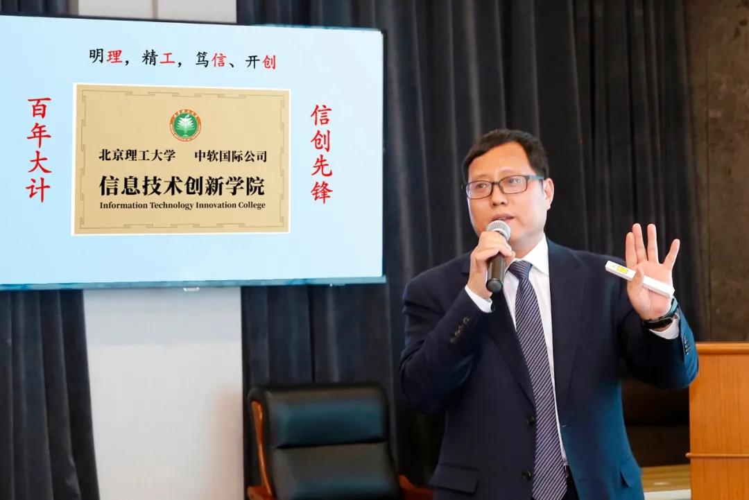 北京理工大學常務副校長龍騰做開場致辭,表示自去年北理工與中軟國際簽訂戰略合作協議以來,校企雙方在人才培養、科技創新等方面開展深入合作,在共建智能網聯汽車研究院、合作開展軟件工程研究生培養和高層次教育培訓等方面取得明顯成績。以信創學院成立為契機,雙方將進一步落實戰略協議,服務國家軟件發展和信創人才培養需求,推動校企雙方貫徹落實新發展理念,推進產教融合、校企協同育人。
